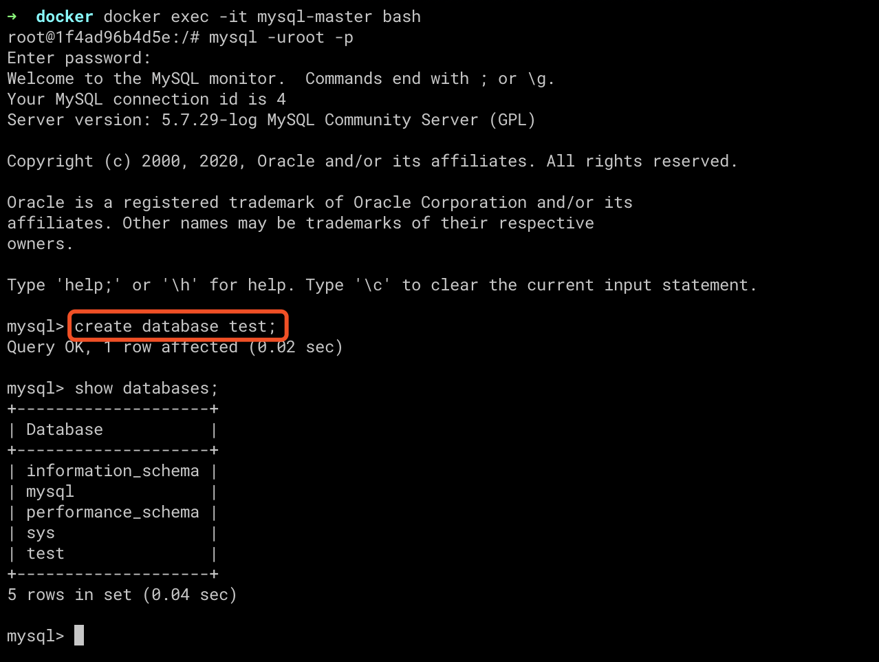 1f4ad96b4d5e mysql:5.7 "docker-entrypoint.s…" 48 seconds ago Up 46 seconds 33060/tcp, 0.0.0.0:3307->3306/tcp mysql-master