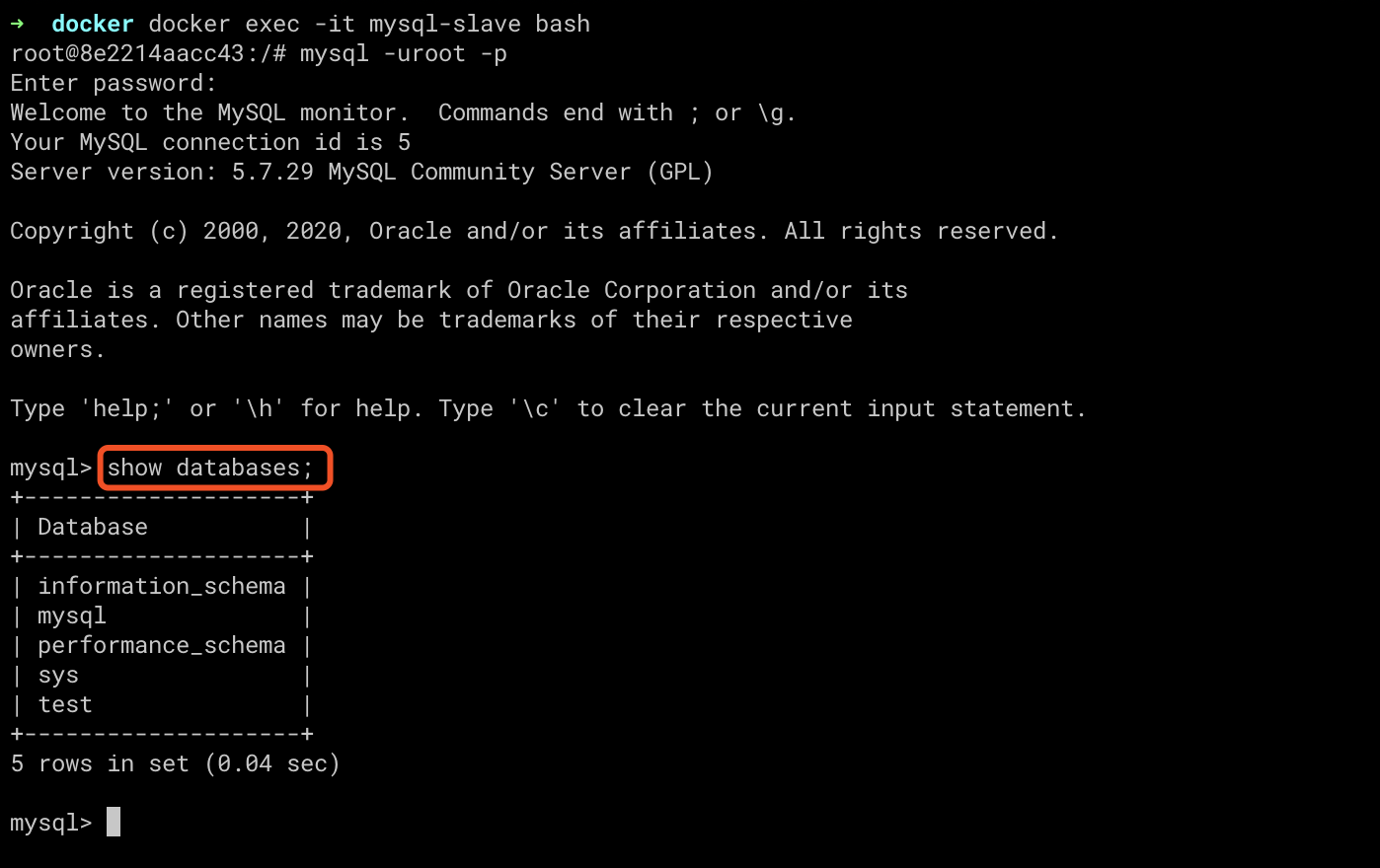 8e2214aacc43 mysql:5.7 "docker-entrypoint.s…" 49 seconds ago Up 47 seconds 33060/tcp, 0.0.0.0:3308->3306/tcp mysql-slave