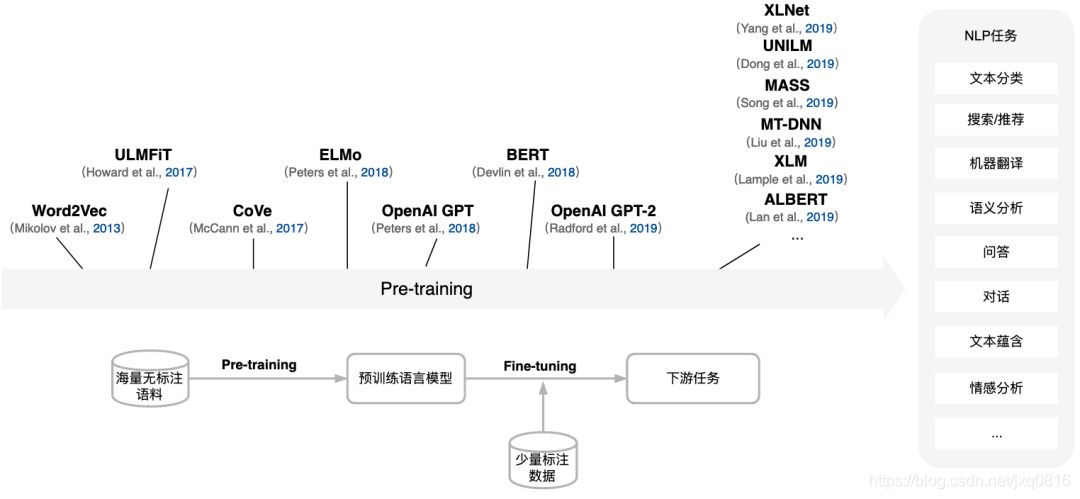 2018年,自然语言处理(Natural Language Processing,NLP)领域最激动人心的进展莫过于预训练语言模型,包括基于RNN的ELMo[1]和ULMFiT[2],基于Transformer[3]的OpenAI GPT[4]及Google BERT[5]等。下图1回顾了近年来预训练语言模型的发展史以及最新的进展。预训练语言模型的成功,证明了我们可以从海量的无标注文本中学到潜在的语义信息,而无需为每一项下游NLP任务单独标注大量训练数据。此外,预训练语言模型的成功也开创了NLP研究的新范式[6],即首先使用大量无监督语料进行语言模型预训练(Pre-training),再使用少量标注语料进行微调(Fine-tuning)来完成具体NLP任务(分类、序列标注、句间关系判断和机器阅读理解等)。