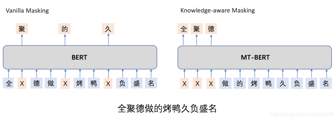 图6左侧展示了BERT模型的MLM任务。输入句子是“全聚德做的烤鸭久负盛名”。其中,“聚”,“的”,“久”3个字在输入时被随机遮蔽,模型预训练过程中需要对这3个遮蔽位做出预测。