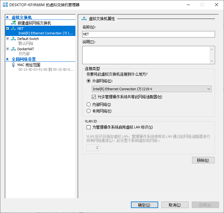 其中,--registry-mirror参数用于设置镜像服务地址,这里设置为国内镜像服务地址。--vm-driver参数设置了虚拟机类型,这里我们使用Hyper-V,默认是VirtualBox。--memory参数设置了虚拟机内存大小。执行此脚本后,会使用默认的Hyper-V的虚拟交换机,我们也可以使用参数--hyperv-virtual-switch进行指定指定的虚拟网络交换机。虚拟网络交换机设置如下图所示: