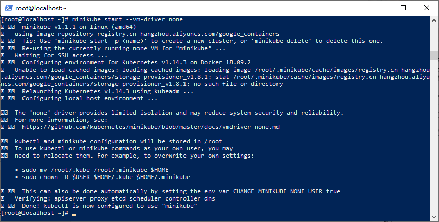 注意:如果直接在主机上运行,Minikube会运行一个不安全的API Server,可能会导致安全隐患,因此不建议在个人工作环境安装。