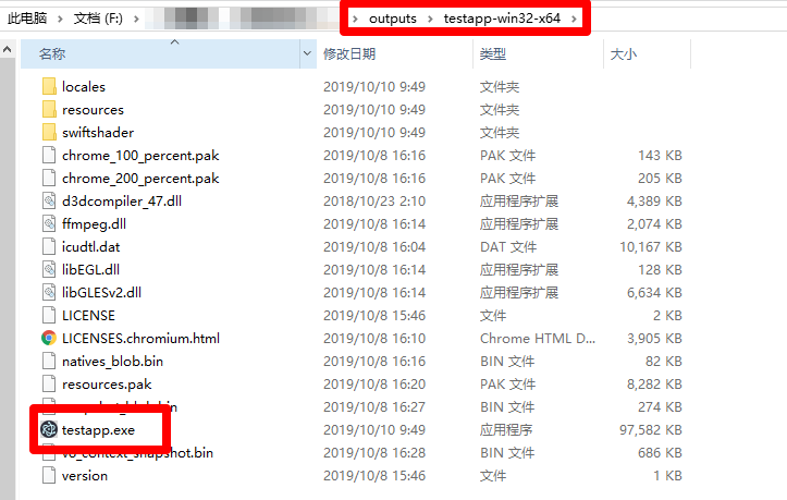 * outputs目录的名字是我们在packager脚本中指定的 * testapp-win32-x64的名字是因为我们指定了生成win平台下的程序, 如果你指定生成linux和mac平台下, 就会出现针对该平台的目录. * testapp.exe同样是我们在packager脚本中指定的名字