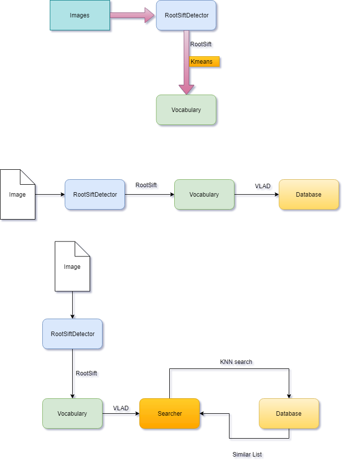 构建图像集的特征数据库的流程通常是offline的,查询的过程则需要是实时的,基本流程参见下图: