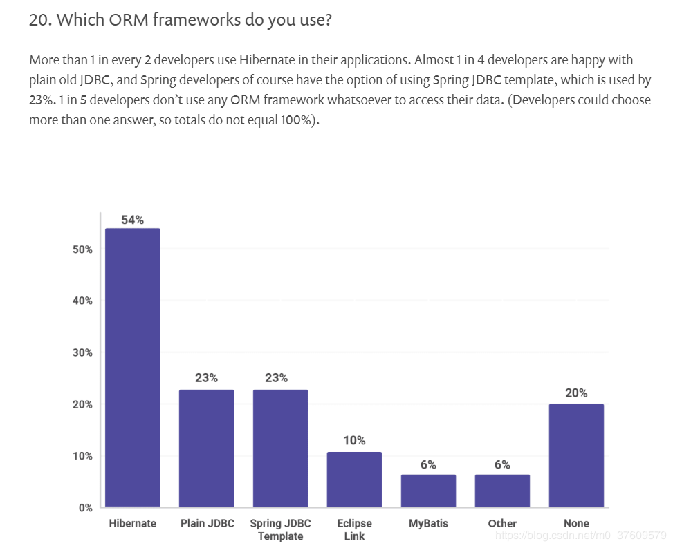 可以看出,Mybatis 的占比只有可怜的 6%,大家看到这个统计结果应该会很吃惊,你会觉得,不对啊,我公司以及我很多朋友都在用 Mybatis 啊,好像没听说过有人用 JPA 的,这个统计结果是错的吧?