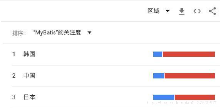 再从下面这个对比来看,MyBatis 的关注主要集中在中日韩。知道日韩为啥也高吗,猜中有奖哦,哈哈!