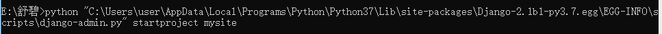 利用安装好的django包的django-admin.py创建项目,命令 python django-admin.py startproject mysite (注意 django-admin.py 路径 ,mysite 是项目文件夹名字)