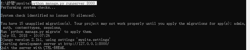 命令行,进入到mysite目录下,启动服务器命令 python manage.py runserver 8000 (端口是可以换的,使用的端口不要被其他进程占用)