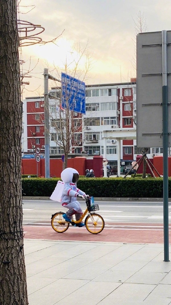 “宇航员也骑自行车上班啊,别耽误了火箭发射。”