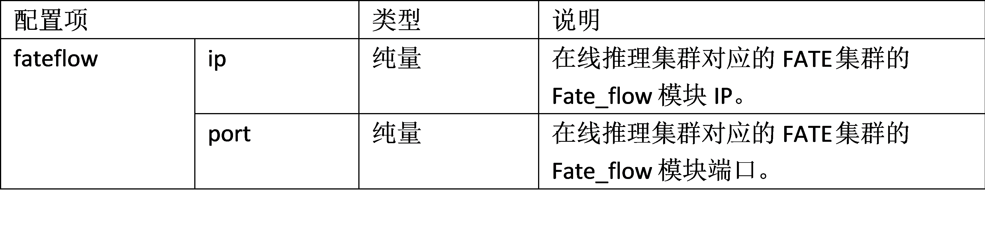 在线推理集群的Server模块需要和对应的FATE集群的Fate_flow通信。所以需要配置Fate_flow的信息。