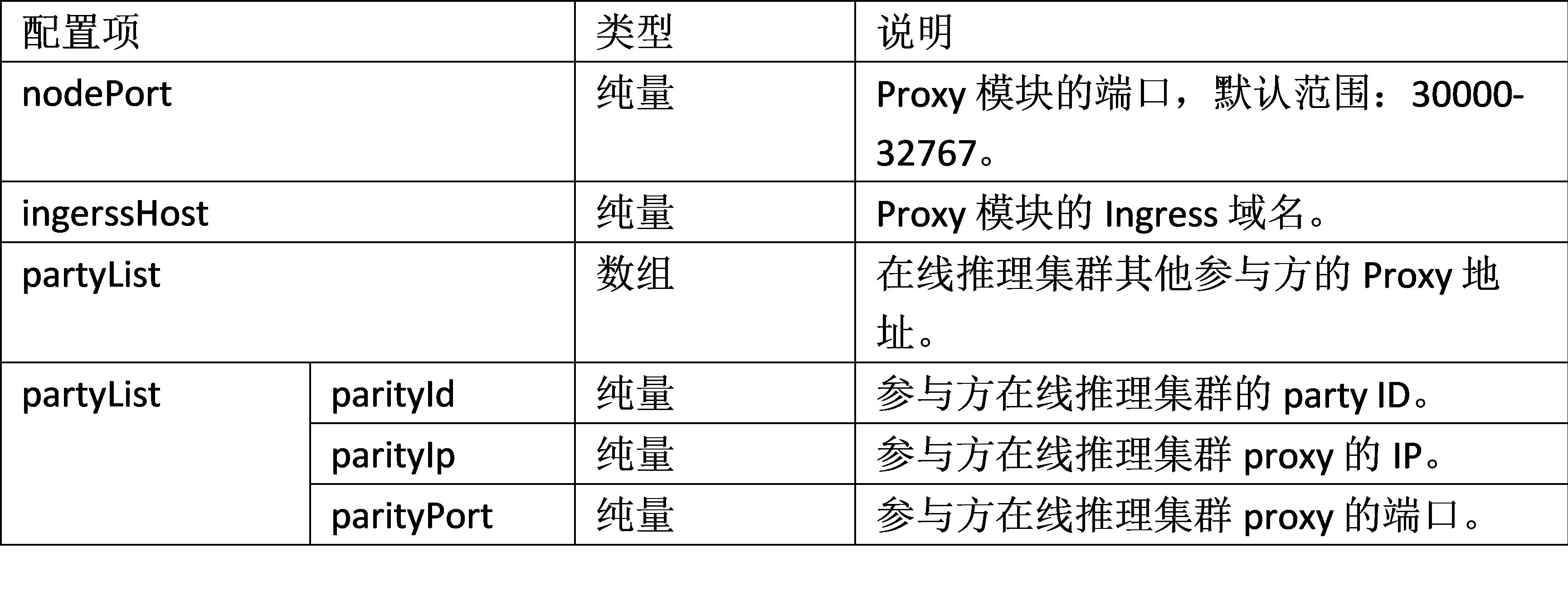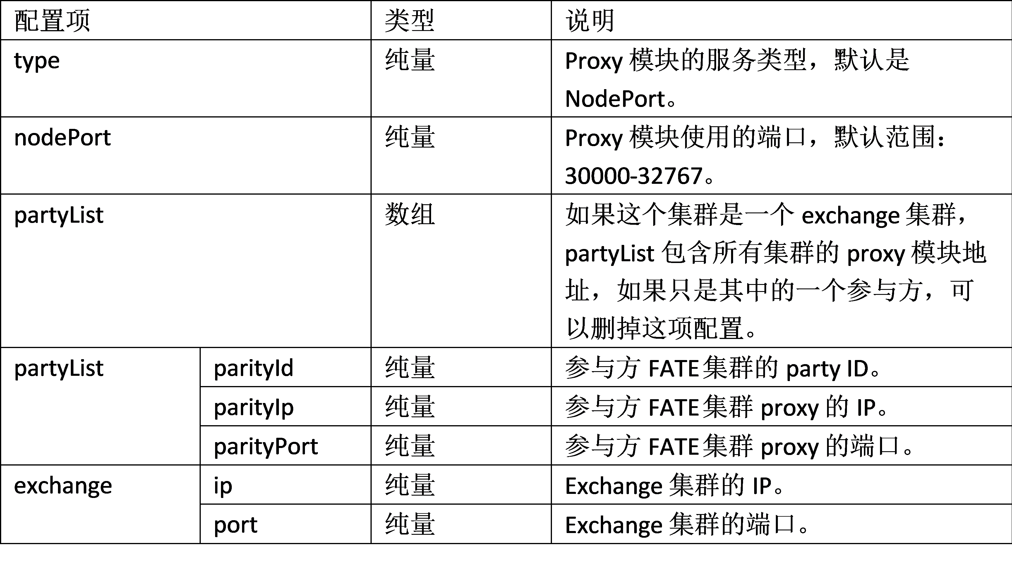 - Exchange集群只需要部署proxy模块。在proxy对象的配置里,partyList需要所有参与方的proxy地址,不需要exchange配置项。