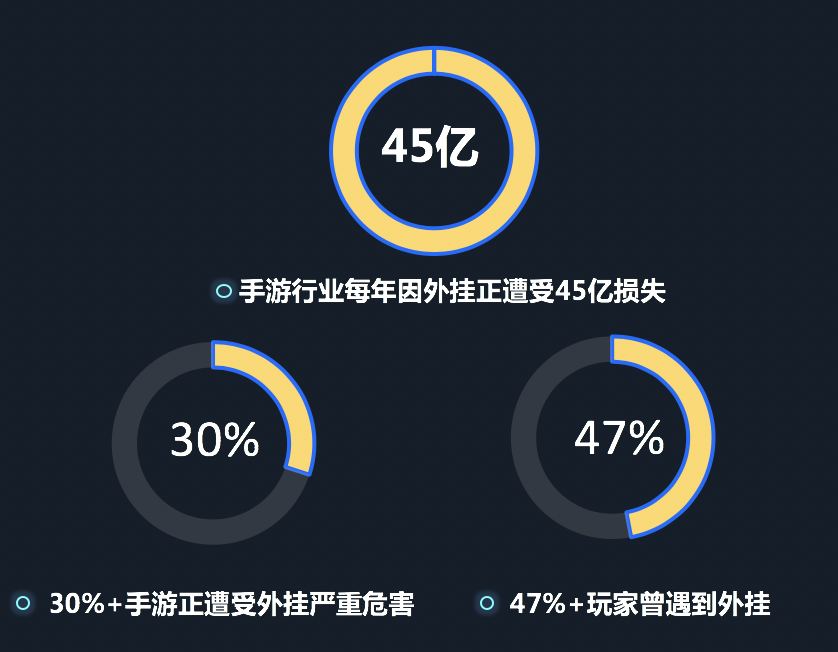 在目前的移动游戏市场上,正有30%+的产品正在遭受外挂的严重危害。外挂篡改游戏正常数值,使部分高价值道具可肆意盗刷,极大地损坏游戏公平性,迫使正常玩家流失,游戏厂商品牌口碑荡然无存。