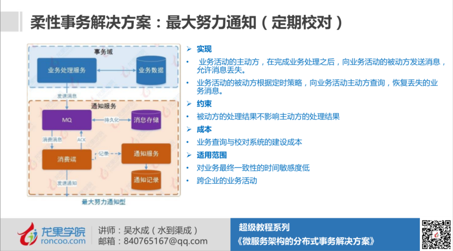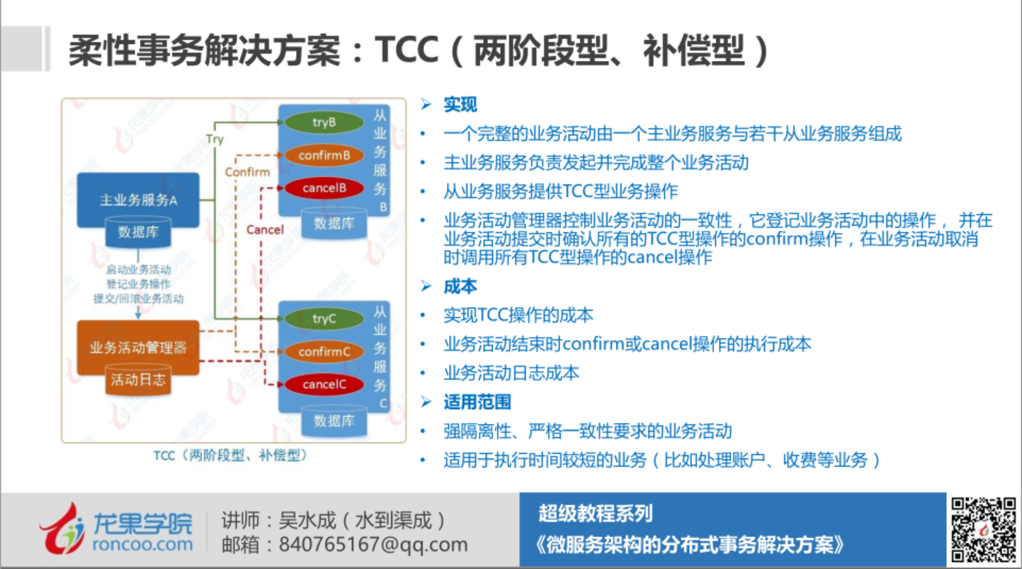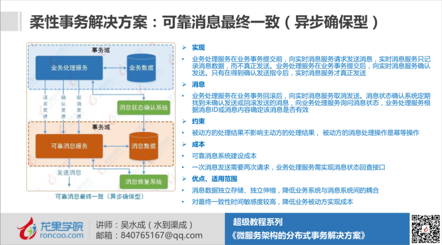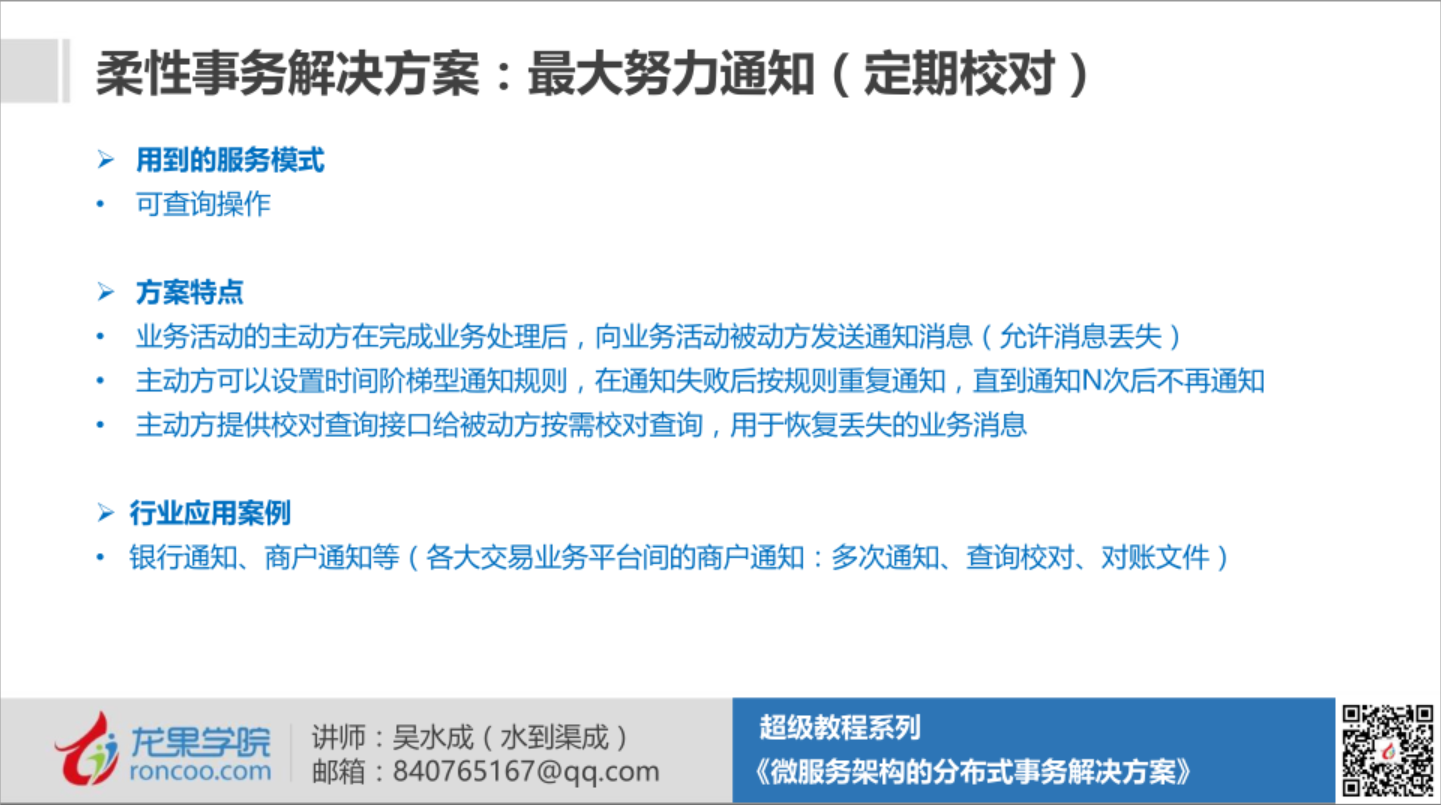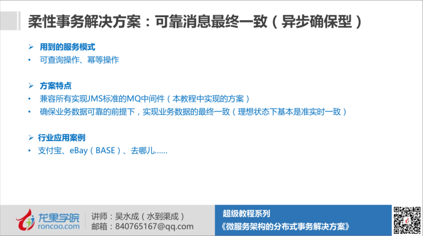为了解决大家在实施分布式服务化架构过程中关于分布式事务问题的困扰,本教程将基于支付系统真实业务中的经典场景来对“可靠消息的最终一致性方案”、“TCC两阶段型方案”和“最大努力通知型方案”这3种柔性事务解决方案进行具体设计实现和详细讲解。