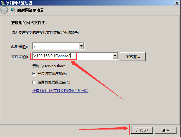 说明:把用户名和密码写到一个配置文件中,这样相对要比写在命令行里要安全一点。以上就是Linux系统上挂载cifs文件系统全部步骤。在windows 上我们一般都是把共享目录映射成一个盘符,然后使用就如同使用本机磁盘一样,具体操作如下