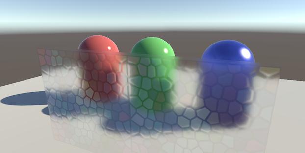 第一个例子BlurryRefraction,和新建摄像机渲染RT类似,在渲染透明对象之前渲染屏幕,并做模糊处理。然后丢给shader转换到对应的UV空间,转换的代码和Grab一样不做赘述。