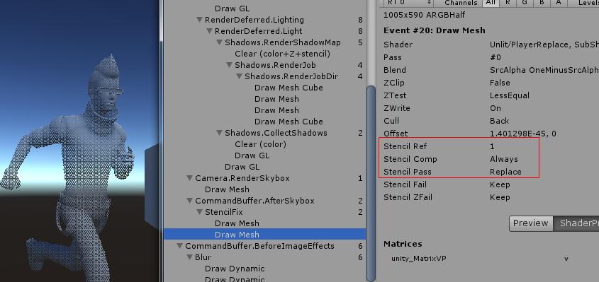 我的思路是通过DrawRenderer在RenderSkybox之后绘制一个alpha为0的主角Renderer,并且带有正常Stencil,来覆盖掉旧的。