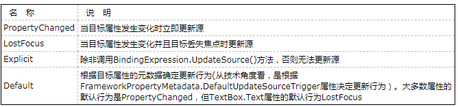 请记住,上表列出的值不印象目标的更新方式。他们仅控制TwoWay或OneWayToSource模式的绑定中源的更新方式。