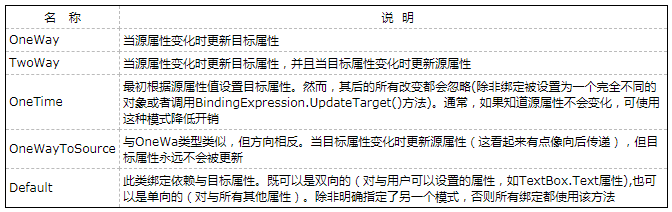 当设置Binding.Mode属性时,WPF允许使用5个System.Windows.Data.BindingMode枚举值中的任何一个。下表列出了全部枚举值: