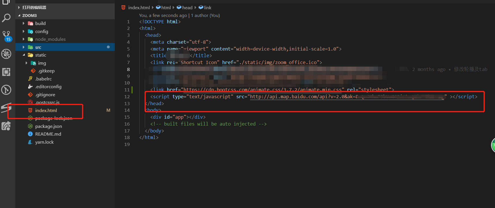申请完了之后我们需要引导到我们项目(vue-cli脚手架搭建项目)中的index.html中,如图: