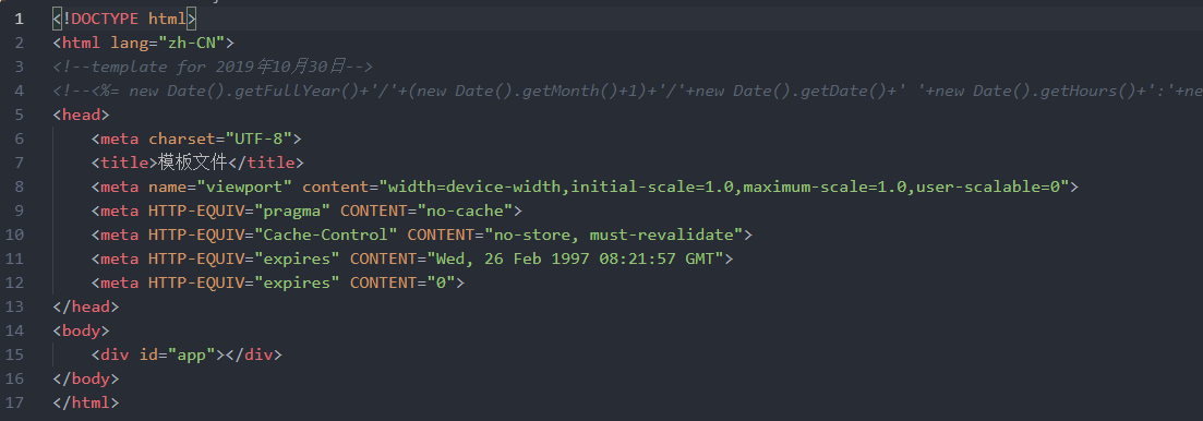 3、编写html模板文件,render>index.ejs,webpack解析、打包vue文件时,以此模板生成html文件