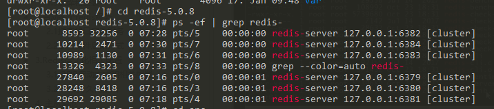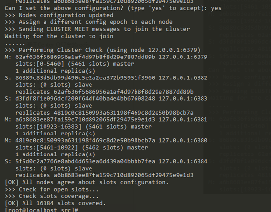 执行命令:redis-cli --cluster create 127.0.0.1:6379 127.0.0.1:6380 127.0.0.1:6381 127.0.0.1:6382 127.0.0.1:6383 127.0.0.1:6384 --cluster-replicas 1