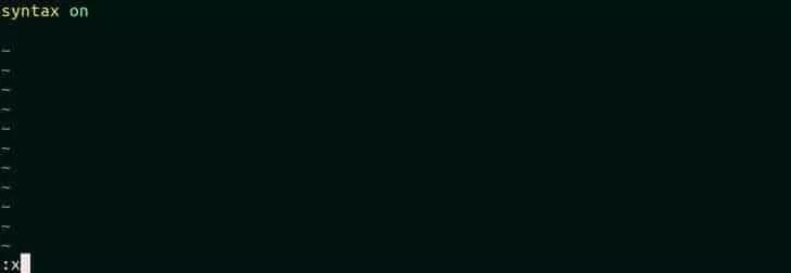 然后,在打开的文件中添加一句 syntax on 命令,代表永久启用语法高亮显示。最后再输入 :wq 保存并关闭文件。