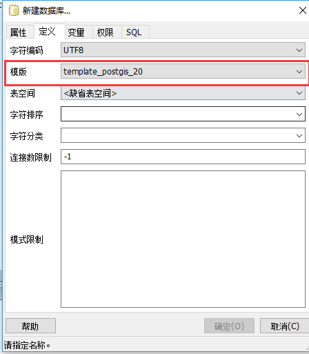 安装好PostgreSQL数据库后打开pdAdmin,创建数据库,在模板中选择templat_postgis-20模板,这是因为在安装PostGIS的时候回把改模板自动创建,引用改模板,可以把PostGIS插件直接添加到我们创建的数据库之中。