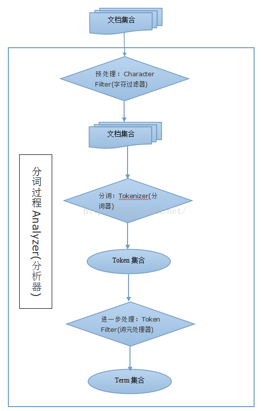 - token filter:词项过滤器,对tokenizer分出的词进行过滤处理。如转小写、停用词处理、同义词处理。一个analyzer可包含0个或多个词项过滤器,按配置顺序进行过滤。