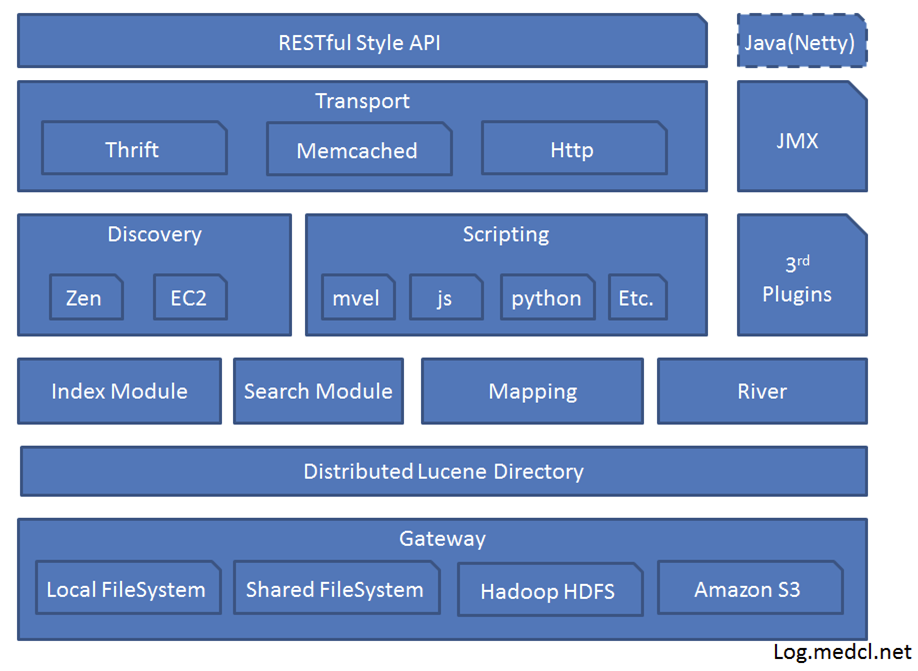 - gateway 代表es索引快照的存储方式,es默认是先把索引存放到内存中,当内存满了时再持久化到本地硬盘。gateway对索引快照进行存储,当这个es集群关闭再重新启动时就会从gateway中读取索引备份数据。es支持多种类型的gateway,有本地文件系统(默认),分布式文件系统,Hadoop的HDFS和amazon的s3云存储服务。