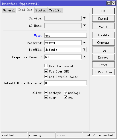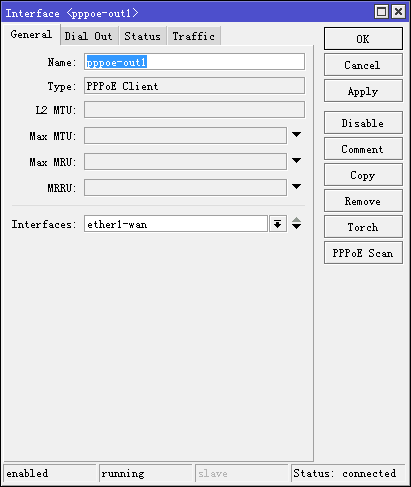 - Interfaces-> 点击左上方的加号,增加PPPoe-Client,,记住选wan口,同时勾选UsePeer Dns,意为使用运营商提供的DNS