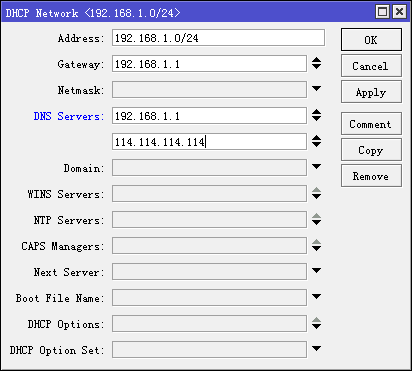 - 设置自动将路由器的地址返给内网的其他电脑:IP->DHCP SERVER->Networks,双击第一个,设置其dns为192.168.1.1,也可以设置成2个