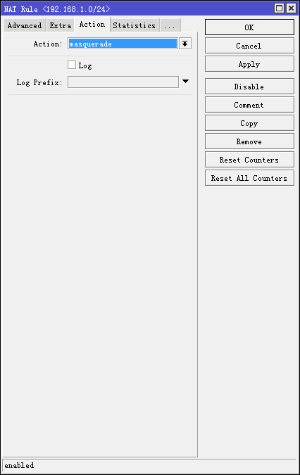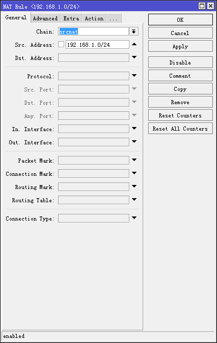 - 开始设置防火墙,IP->Firewall->NAT,增加一个,General的Chain选srcnat,Action选masquerade(ip欺骗,意为内网所有电脑都通过lan共享上网),至此,内网的所有电脑应该都可以上网了