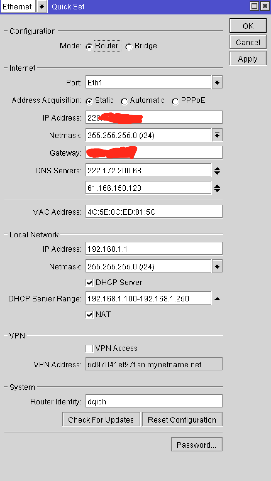 0. Quick Set 快速设置(eth1口接外网网线,eth2接局域网网线,其他口也就有接局域网网线),设置成功后应该直接可以上网了,后续步骤无需设置,设置如下: