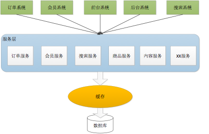 SOA架构为高并发而生,需要解决高并发下不同服务之间的通信问题。在实践中,SOA架构需要配合多种中间件技术,包括缓存服务、数据库中间件、服务发布和订阅、消息队列等等。以下为一个典型的SOA商城架构简图: