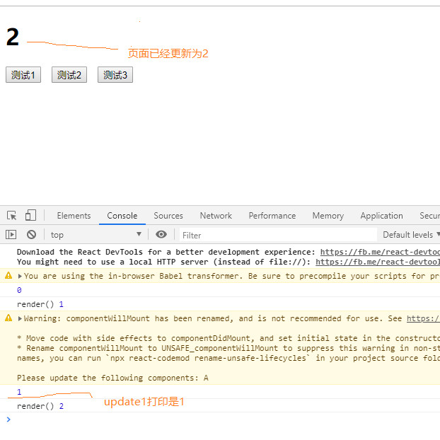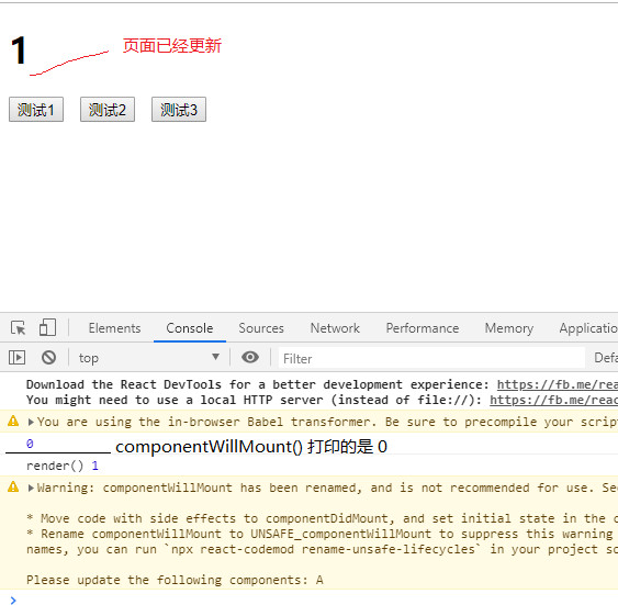 我们在 React 事件监听回调 update1 和 组件生命周期 componentWillMount() 钩子里面分别在setState()之后打印最新的 state 值,发现打印出来的还是修改之前的state,但是页面已经更新为最新状态,看图:
