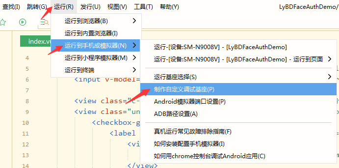 需要打自定义基座才可以进行测试,运行->运行到手机或模拟器->制作自定义基座。注意事项看图片,请使用自己的证书(就是签名文件.jks),申请百度授权文件的时候填写这个证书的 md5。每次打自定义基座的时候,最好先把旧的基座删除(如果存在),路径在根目录下的 unpackage 文件夹里面(LyBDFaceAuthDemo\unpackage\debug\android_debug.apk)。