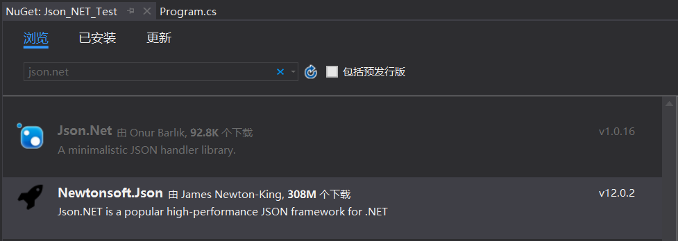 首先去官网下载最新的Newtonsoft.Json.dll(也可以使用VS自带的NuGet搜索Json.NET下载(下载下图第二个))并引用至项目。