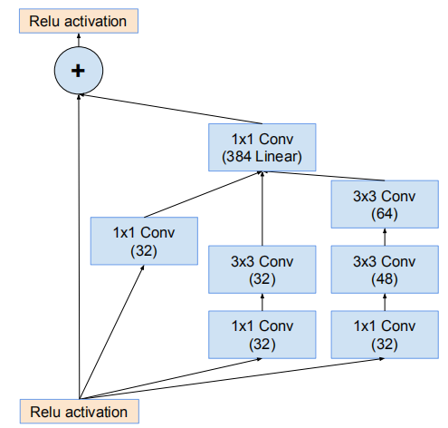 残差版本的Inception网络使用了比源Inception更廉价的Inception块。每个Inception块后紧连接着滤波膨胀层(没有激活函数的1×1卷积)以在相加之前放大滤波器组的维度,以实现输入的匹配。这样补偿了在Inception块中的降维。