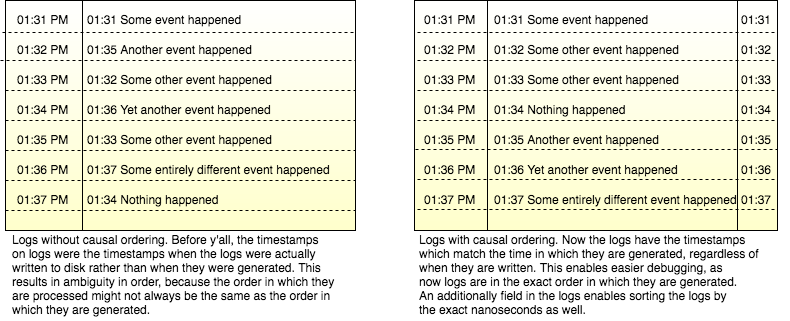 - 日志是某个时间点的事件。事件的顺序给与我们系统发生了什么的完整历史。然而,我们Golang服务的核心日志库没有保存日志的产生时间(而是写入时间)。这导致了在几微妙内产生的日志造成混乱。这不仅使开发者的生活更困难,而且几乎无法准确的获得系统的历史事件。这就是我们想改进和启用因果排序的日志——是了解系统事件的关键一步。