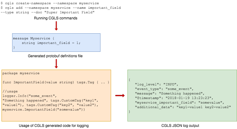 为了解决这些,我们构建一个允许我们确定地为日志添加结构。这是建立在我们可以用特殊的字段名和类型添加键值对的架构之上。根据该模式生成代码,并使用生成的代码确保事物的一致的格式且不会中断。我们称这种模式(键名和类型对的集合)为Common Grab Log Schema (CGLS)。我们仅向CGLS中添加结构是很重要的——CGLS中包含的所有内容在不同的字段中格式化,其他内容在生成的JSON中的单个字段中格式化。这有助于保持我们的结构一直并且易于使用Elastic stack。