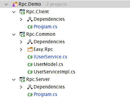 DEMO结构如下(Easy.Rpc源码目前也包含在这个里面,过两天单独拎出来做成框架,方便调用)