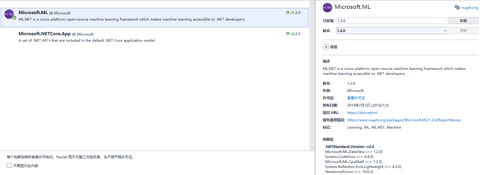 2. 添加Microsoft.ML nuget 1.2.0版本