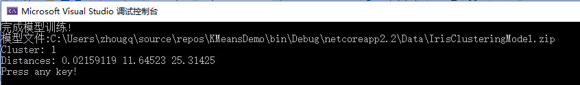 - 构造MLContext、从iris.data构造IDataView,采用Trainers.KMeans进行模型训练,形成模型文件:IrisClusteringModel.zip