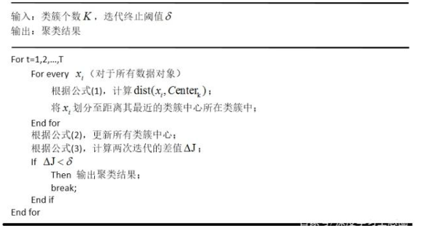 数据对象间距离的计算有很多种,k-means算法通常采用欧氏距离来计算数据对象间的距离。算法详细的流程描述如下: