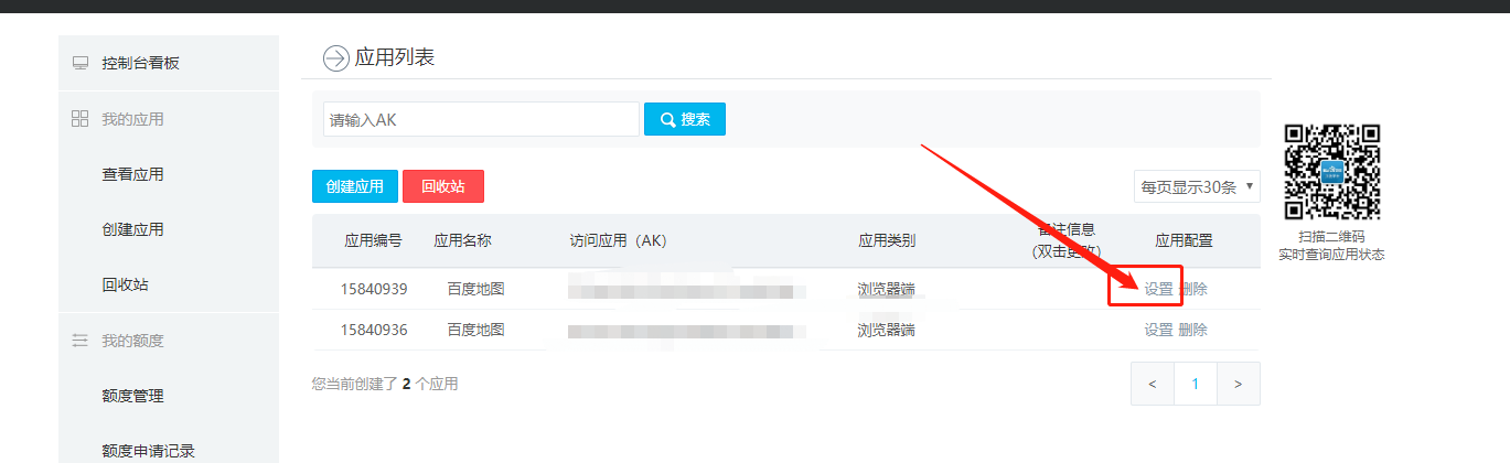 这里的ak需要去官方申请秘钥,地址在这里,需要注意的是,申请完成之后会给你两个秘钥,我们需要给调起服务主机的ip加到白名单里,不然会有访问权限错误,由于现在是开发环境,所以我设置的是通配符*,也就是所有的主机,但是正是环境就不推荐这么做了,原因是前端代码容易泄露AK,被其他网站非法调用。
