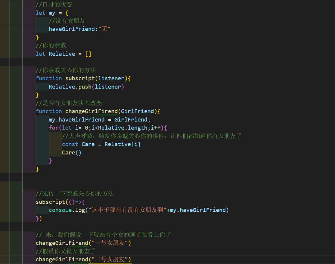 当你的状态发生改变时,就会触发亲戚订阅你的方法,从而告诉你的亲戚们,你有对象了(当然这只是个例子,你以为你会有对象?别天真了)