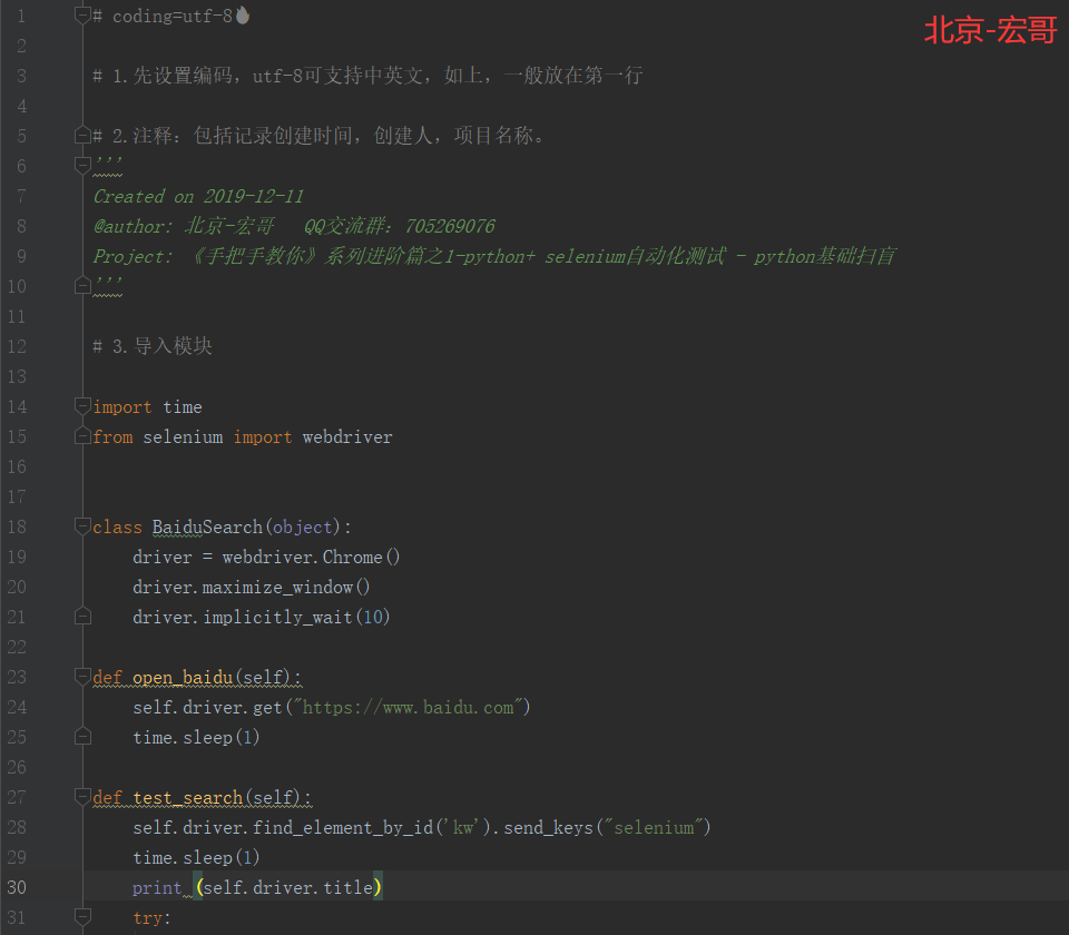 这里宏哥以下用百度搜索举例,模仿上面用类调用实例的方法来写这个脚本,可能看起来比较啰嗦,但是代码多了,你就会体会到类的作用,注意这里self指的是当前BaiduSearch这个类本身: