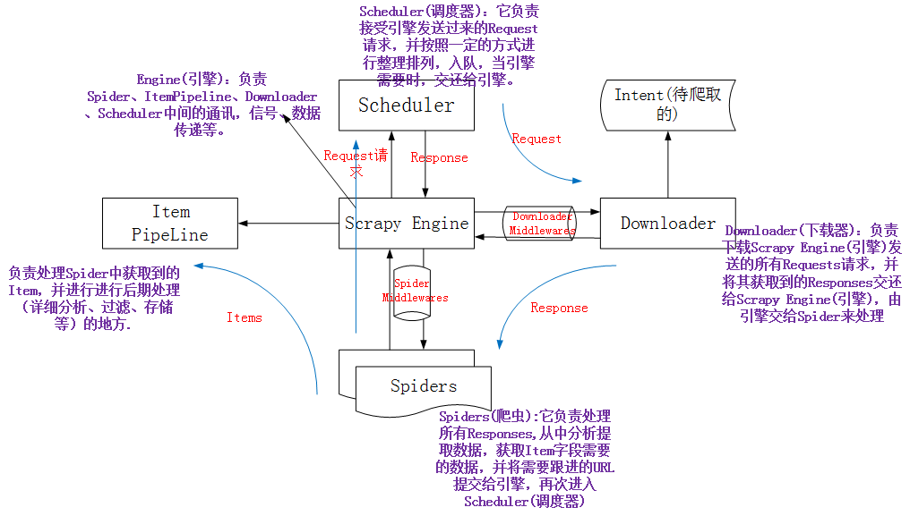 前面介绍了scrapy的基本操作,下面介绍下scrapy爬虫的内部实现架构如下图