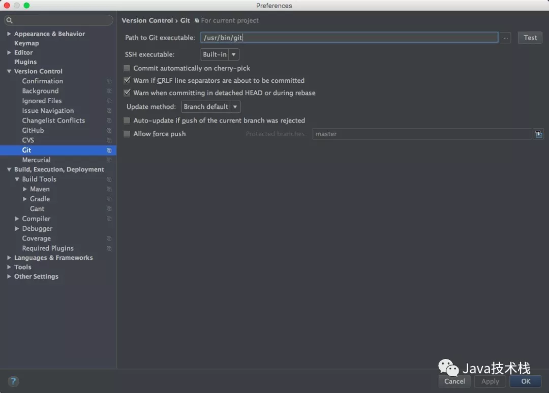 IntelliJ IDEA->Performance->Version Control->git 将自己安装git的可执行文件路径填入Path to Git executable,点击 Test测试一下。