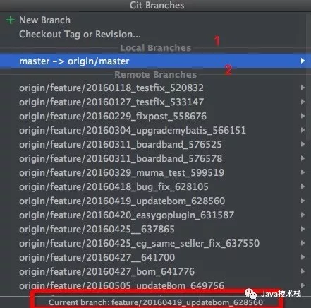 checkout出来,会在底端显示当前的分支。其中1显示的为本地仓库中的版本,2为远程仓库中的版本。